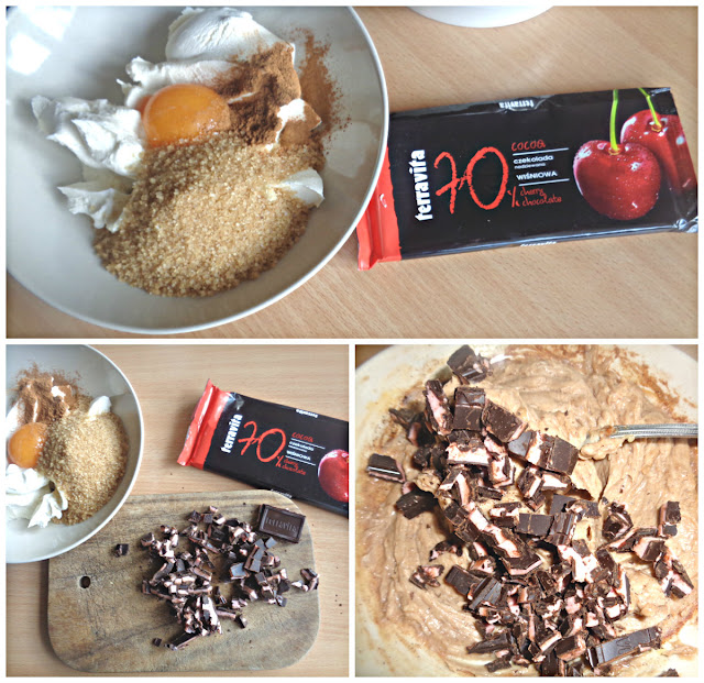 - dodaj drobno pokrojoną czekoladę, delikatnie wymieszaj i rozsmaruj na rozwałkowanym cieście